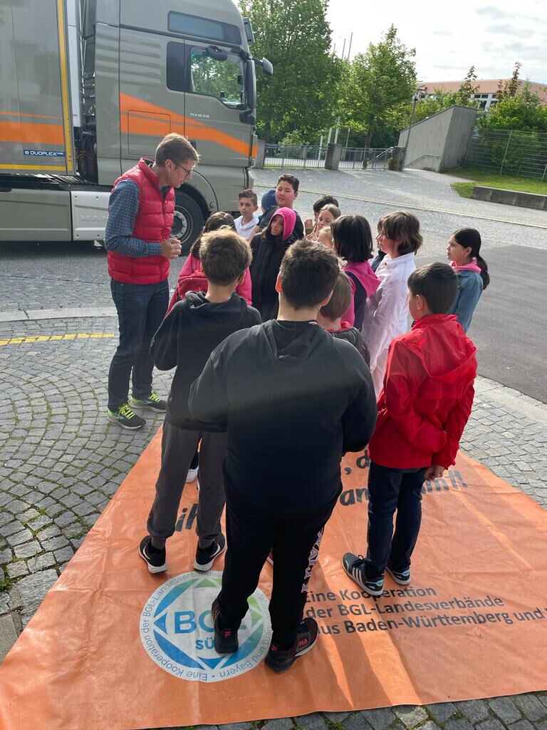 Auf Initiative der Niedermaier Speditions GmbH aus Landau, die auch den Lkw stellte, demonstrierte der LBT-Geschäftsführer für Niederbayern/Oberpfalz, Harald Sentner den Kindern anschaulich anhand nachgestellter Situationen mit einem Lkw und einer Toter-Winkel-Plane die Gefahrenpotentiale durch den Toten Winkel. Dass auf der Plane die komplette Gruppe Platz hatte und damit dem Lkw-Fahrer verborgen blieb, sorgte doch für einiges Erstaunen. Dazu ergänzt Sentner: „Selbst die Profis, also die Lkw-Fahrer, sind immer wieder verblüfft, wenn sie sehen, wie viel sie nicht sehen."