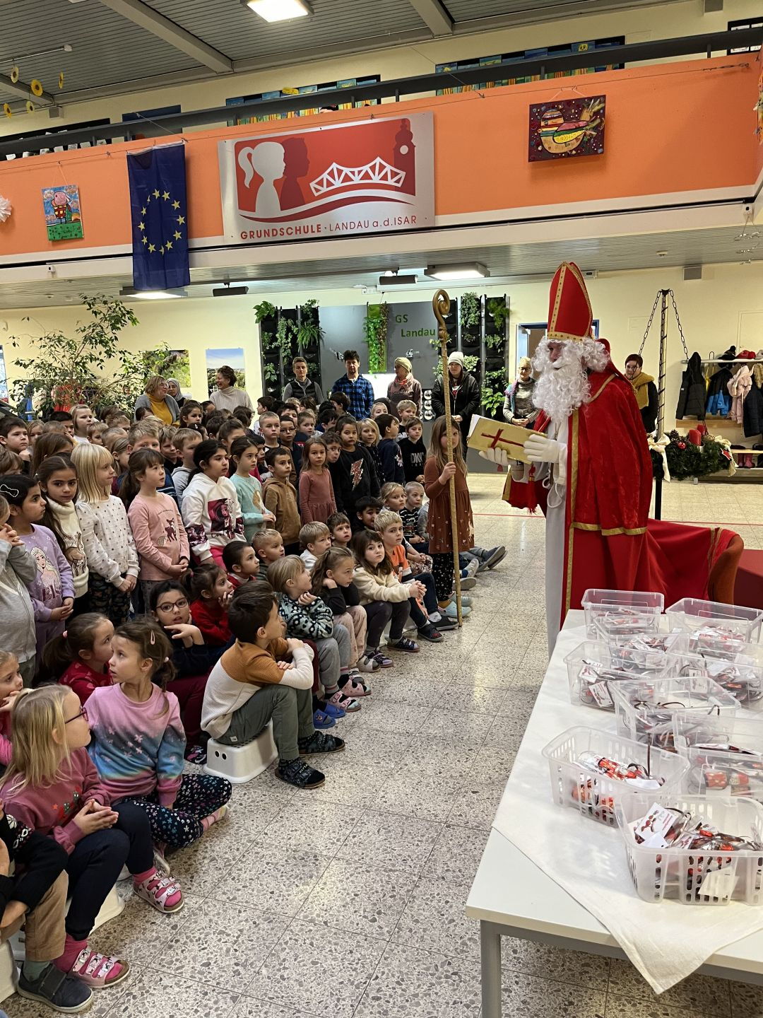 In der weihnachtlich geschmückten Aula wurde eine schöne Nikolausfeier abgehalten. Empfangen wurde der heilige Mann mit Liedern und es gab viele Geschichten aus seinem Leben. Natürlich überreichte der gute mann den braven Schülerinnen und Schülern Geschenke.