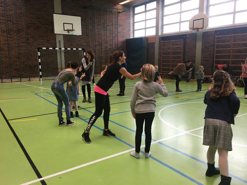 Die Schüler der Klassen 3c und 1e turnen gemeinsam. Das Kooperationsprojekt der Lehrerinnen Frau Friedberger und Frau Floren wurde durch eine gemeinsame Sportstunde fortgesetzt. Nach den Tanzstunden zum Pippi Langstrumpflied wurde jetzt geturnt. Dabei standen neben Sicherheit und Freundschaften knüpfen der Aufbau von Muskelkraft und Geschicklichkeit im Mittelpunkt. Alle waren begeistert!