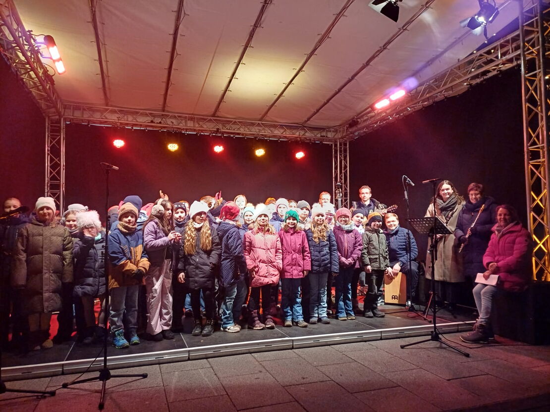 Gestern Abend hatte die Klasse 3b und die AG Chor ihren großen Auftritt auf dem Adventsmarkt der Stadt Landau gemeinsam mit der Klasse 5c der Mittelschule Landau. Gemeinsam präsentierten die Schülerinnen und Schüler ein stimmungsvolles Programm voller Weihnachtslieder.