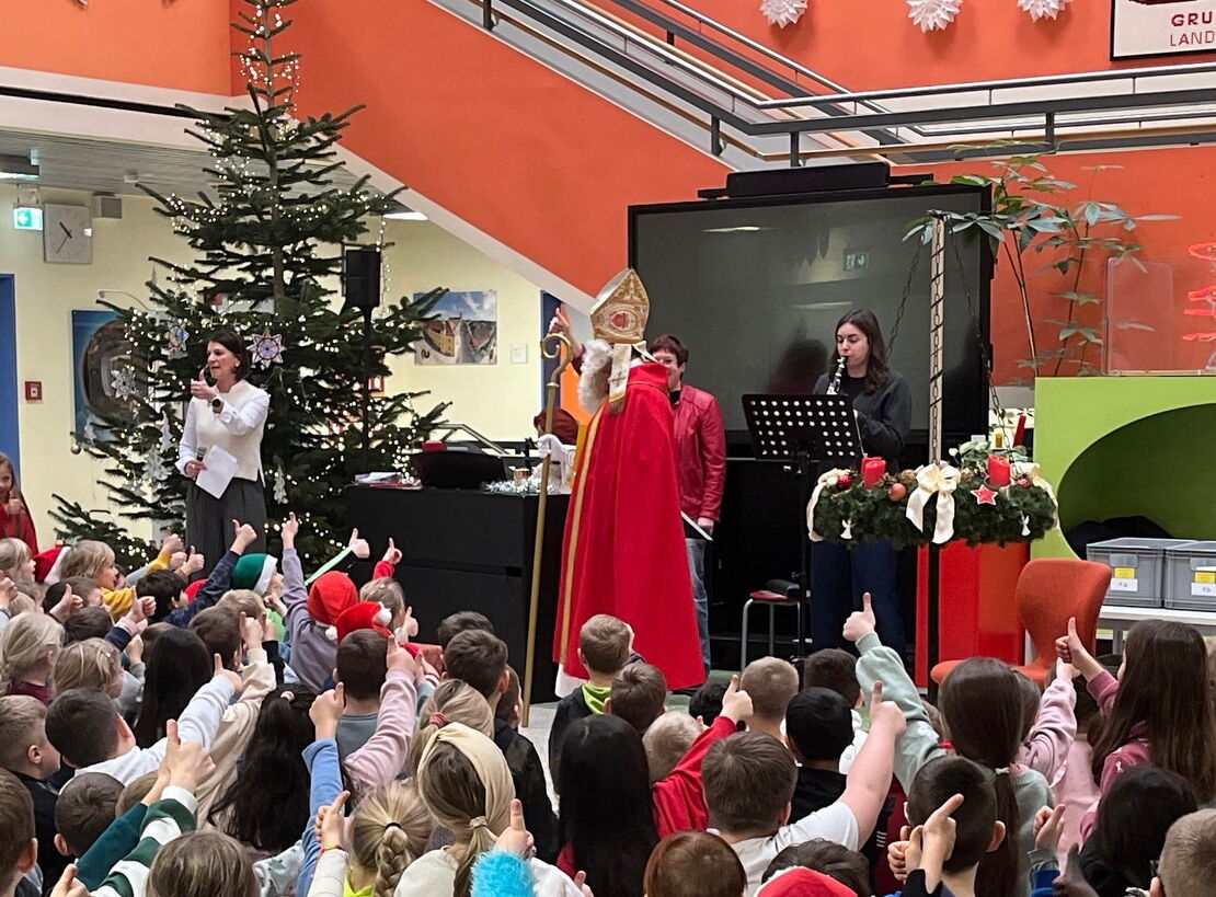 Am 5. Dezember besuchte der Hl. Nikolaus die Schülerinnen und Schüler der ersten und zweiten Klassen in der Aula. Zur Begrüßung sangen die Kinder stimmungsvolle Lieder. Die Klasse 2a trug ein schönes Nikolausgedicht vor. Der Nikolaus bedankte sich herzlich für die Beiträge und brachte für jede Klasse kleine Geschenke mit. Ein besonderer Moment, der allen in schöner Erinnerung bleiben wird.