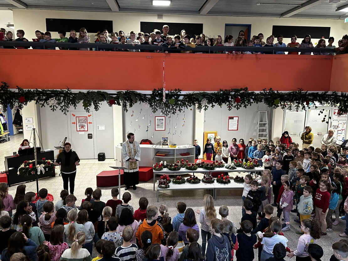 In der Aula versammelten sich die Schülerinnen und Schüler zur festlichen Adventskranzsegnung, die von Kaplan Florian Schwarz geleitet wurde. Gemeinsam sangen sie besinnliche Adventslieder, während Kaplan Schwarz die Kränze segnete und einen Segen für die bevorstehende Adventszeit sprach. Die feierliche Atmosphäre und die musikalische Begleitung stärkten das Gemeinschaftsgefühl und stimmten alle auf die besinnlichen Wochen vor Weihnachten ein. Vielen Dank an unsere Eltern für die Bereitstellung der festlichen Kränze!